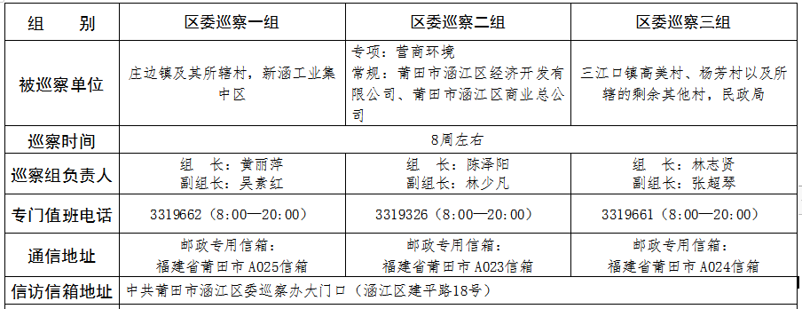 十届涵江区委第二轮巡察公告